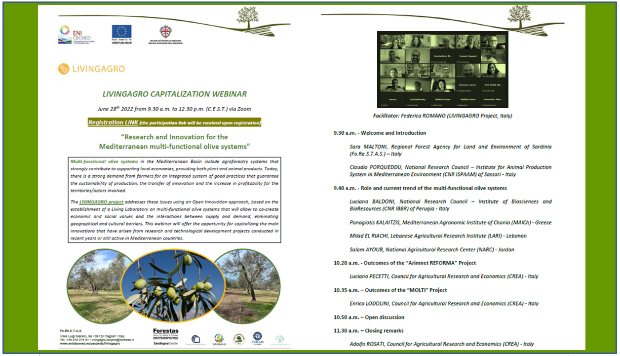 On June 28, 2022 the Italian National Research Council (CNR) organized a project capitalization webinar that concentrated on innovation and transfer of knowledge regarding Mediterranean multifunctional olive systems (the focus of LIVINGAGRO’s Living Lab 1). Stakeholders of the involved project countries (Greece, Italy, Jordan and Lebanon) participated in the webinar. This event followed a first capitalization webinar focused on grazed woodlands (the project’s second Living Lab), which was organized by CNR on January 28, 2021 to investigate innovations and best practices for this agroforestry sector.